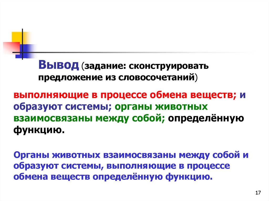 Вывод (задание: сконструироватьпредложение из словосочетаний)