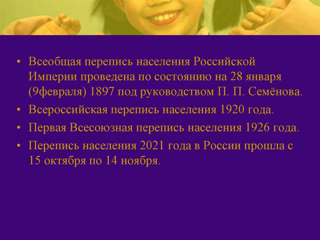 • Всеобщая перепись населения РоссийскойИмперии проведена по состоянию на 28 января