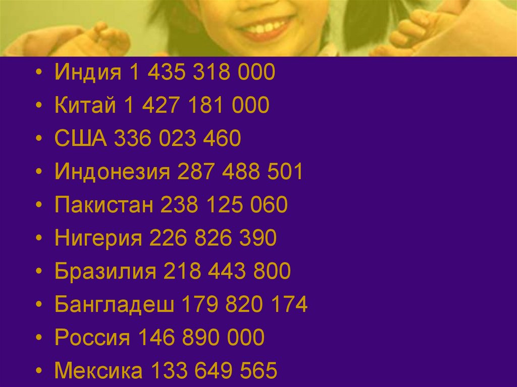 • Индия 1 435 318 000• Китай 1 427 181 000