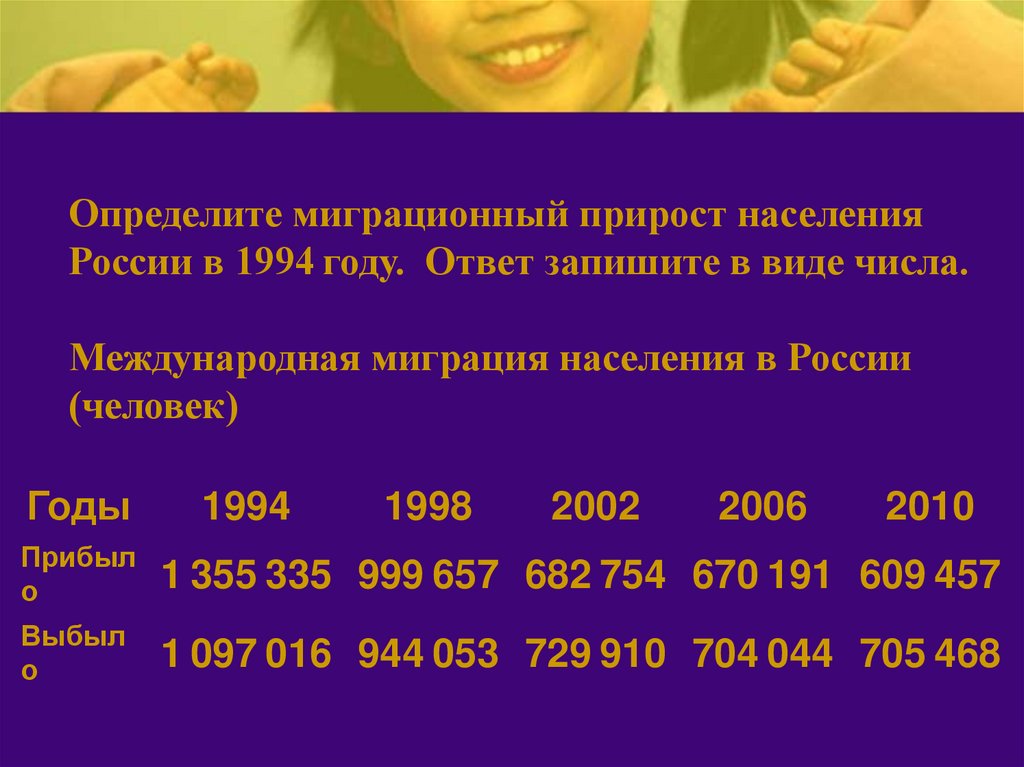 Определите миграционный прирост населенияРоссии в 1994 году. Ответ запишите в виде числа.
