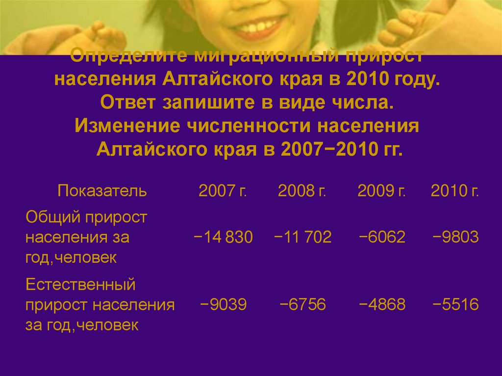 Определите миграционный приростнаселения Алтайского края в 2010 году.