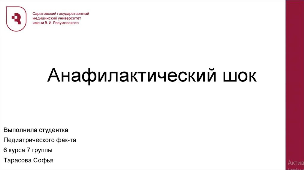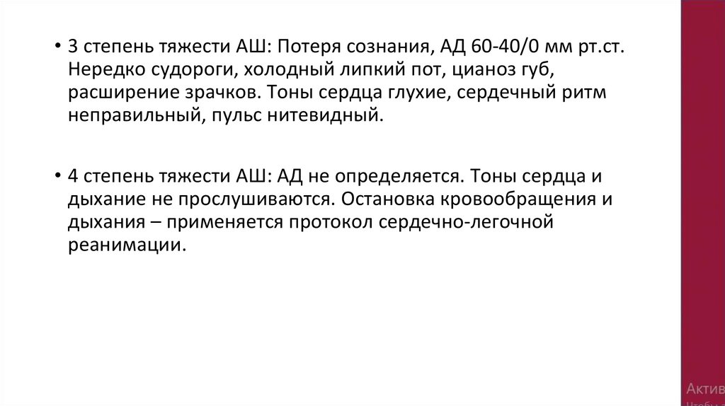 • 3 степень тяжести АШ: Потеря сознания, АД 60-40/0 мм рт.ст.Нередко судороги, холодный липкий пот, цианоз губ,