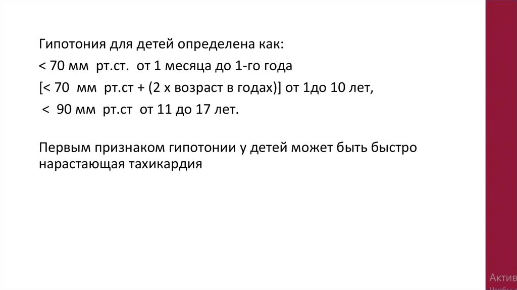 Гипотония для детей определена как:< 70 мм рт.ст. от 1 месяца до 1-го года