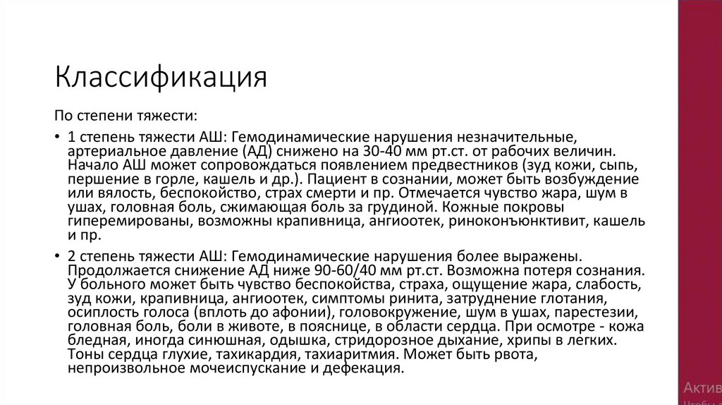 • 1 степень тяжести АШ: Гемодинамические нарушения незначительные,