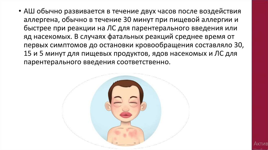 • АШ обычно развивается в течение двух часов после воздействияаллергена, обычно в течение 30 минут при пищевой аллергии и