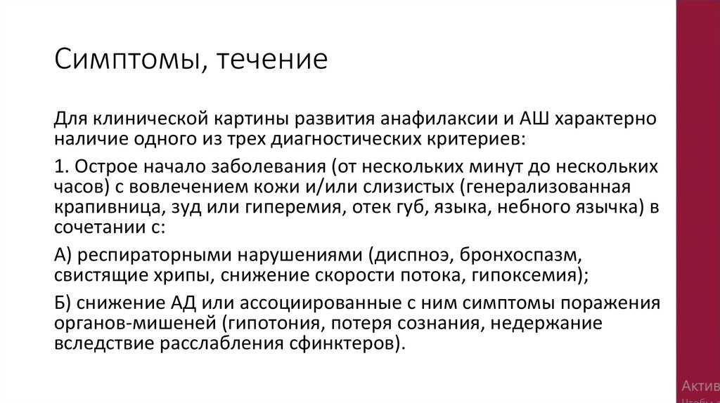 Cимптомы, течениеДля клинической картины развития анафилаксии и АШ характерно