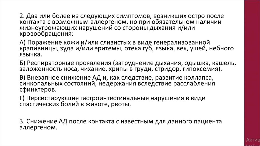 2. Два или более из следующих симптомов, возникших остро послеконтакта с возможным аллергеном, но при обязательном наличии