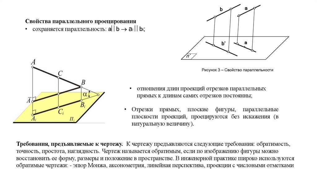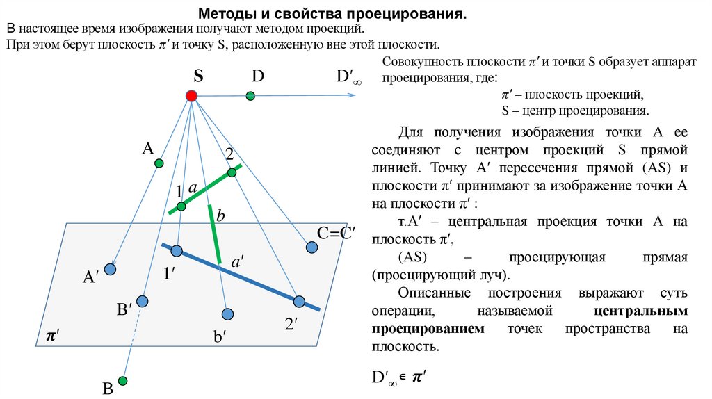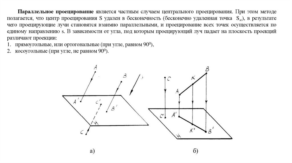 Параллельное проецирование является частным случаем центрального проецирования. При этом методеполагается, что центр проецирования S удален в бесконечность (бесконечно удаленная точка S∞), в результате
