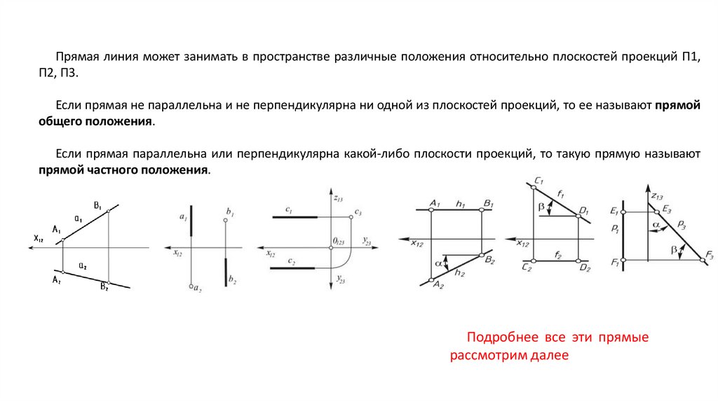Прямая линия может занимать в пространстве различные положения относительно плоскостей проекций Π1,Π2, Π3.