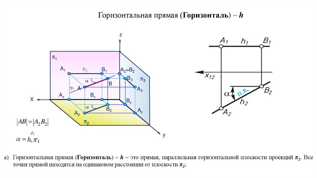 a) Горизонтальная прямая (Горизонталь) – h – это прямая, параллельная горизонтальной плоскости проекций π2. Все