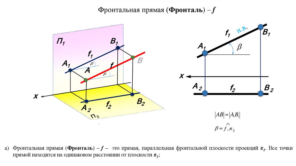 a) Фронтальная прямая (Фронталь) – f – это прямая, параллельная фронтальной плоскости проекций π1. Все точки