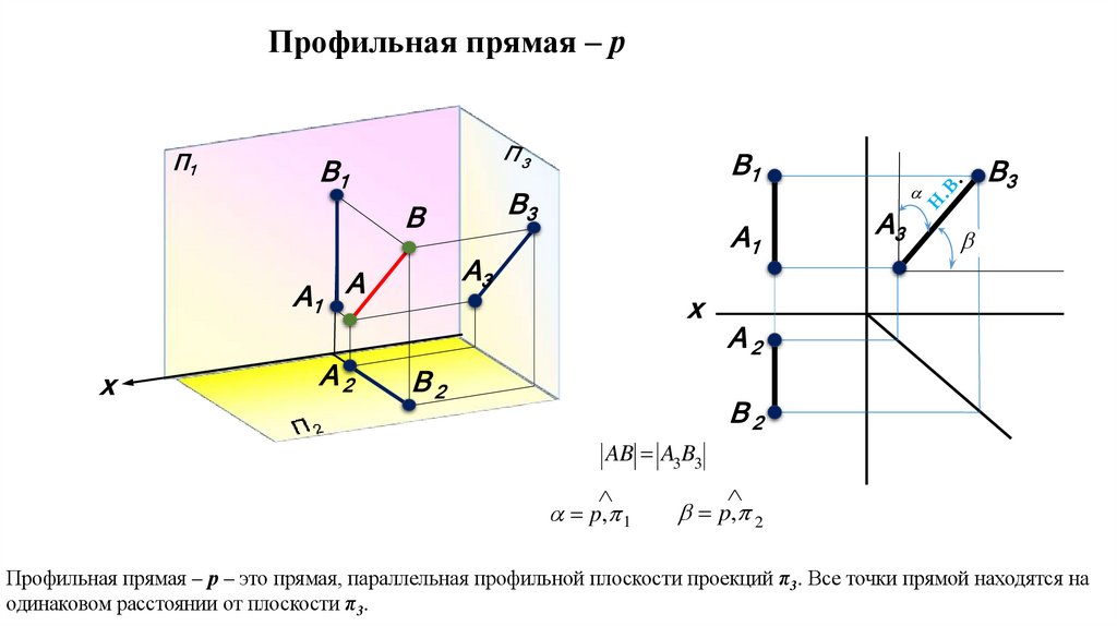 Профильная прямая – р – это прямая, параллельная профильной плоскости проекций π3. Все точки прямой находятся на