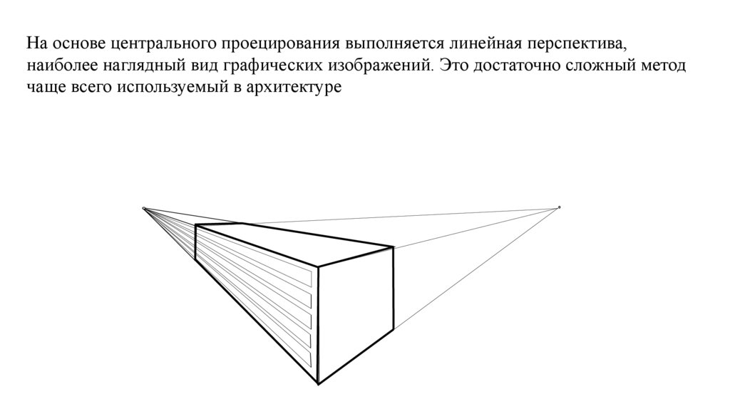 На основе центрального проецирования выполняется линейная перспектива,наиболее наглядный вид графических изображений. Это достаточно сложный метод