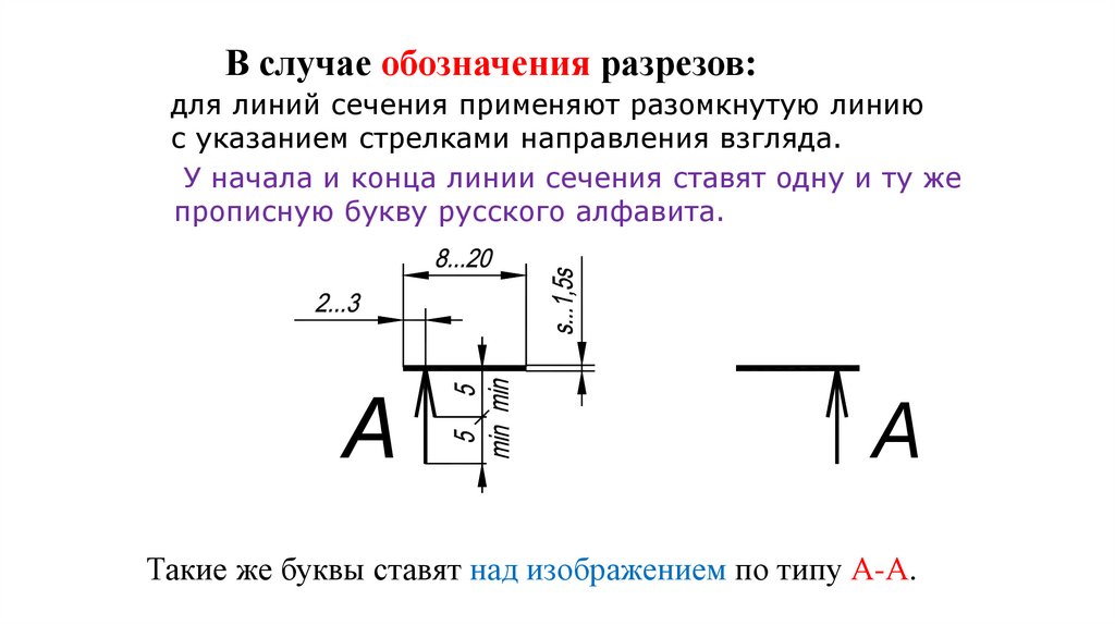 В случае обозначения разрезов:для линий сечения применяют разомкнутую линию