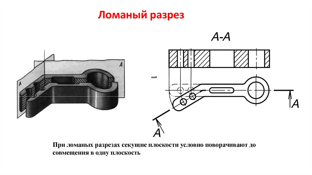 При ломаных разрезах секущие плоскости условно повертывают до совмещения в