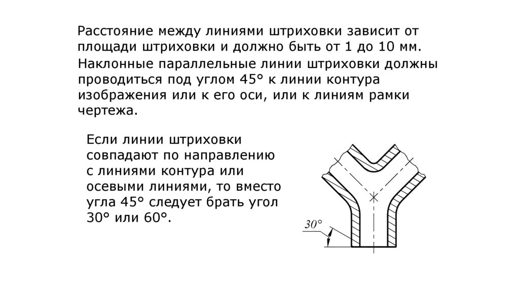 Расстояние между линиями штриховки зависит отплощади штриховки и должно быть от 1 до 10 мм.