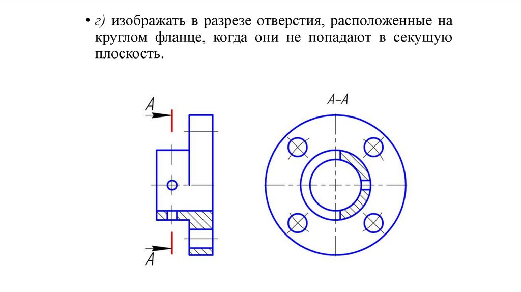 • г) изображать в разрезе отверстия, расположенные накруглом фланце, когда они не попадают в секущую