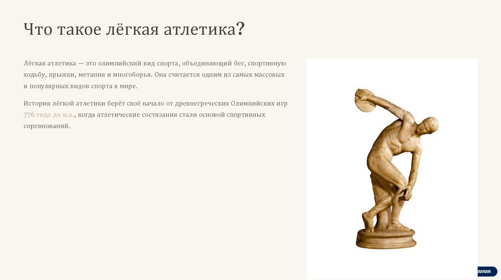 Что такое лёгкая атлетика?Лёгкая атлетика — это олимпийский вид спорта, объединяющий бег, спортивную