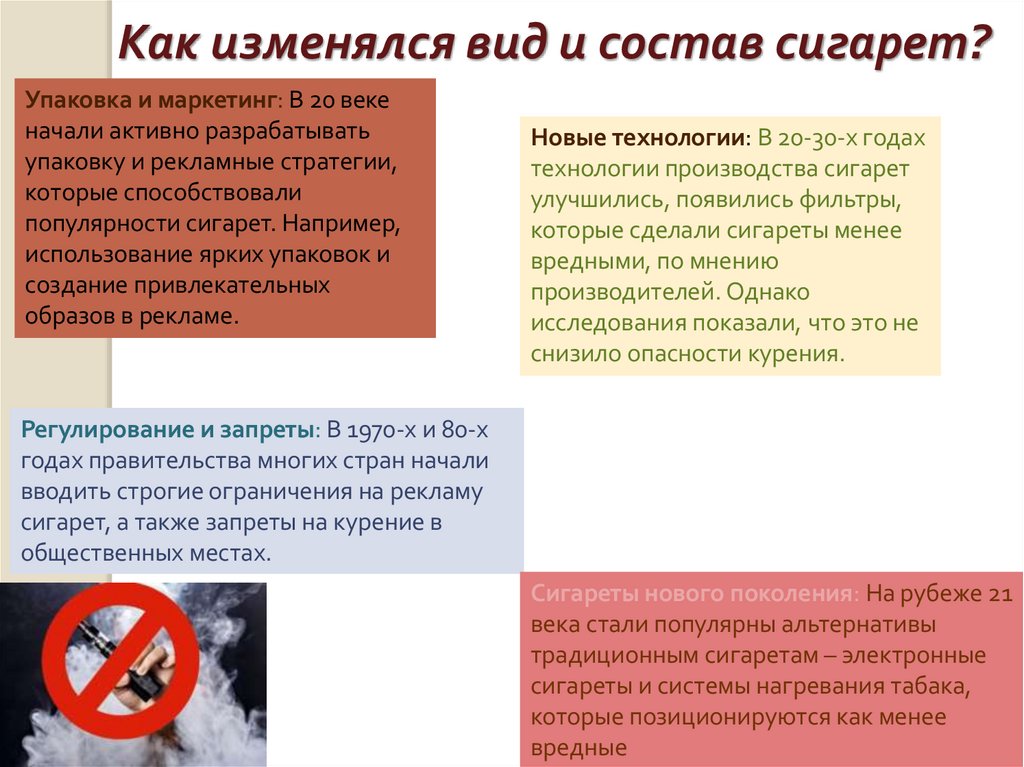 Как изменялся вид и состав сигарет?Упаковка и маркетинг: В 20 веке
