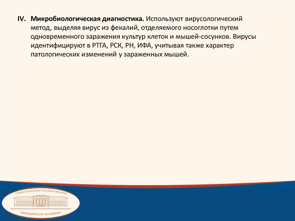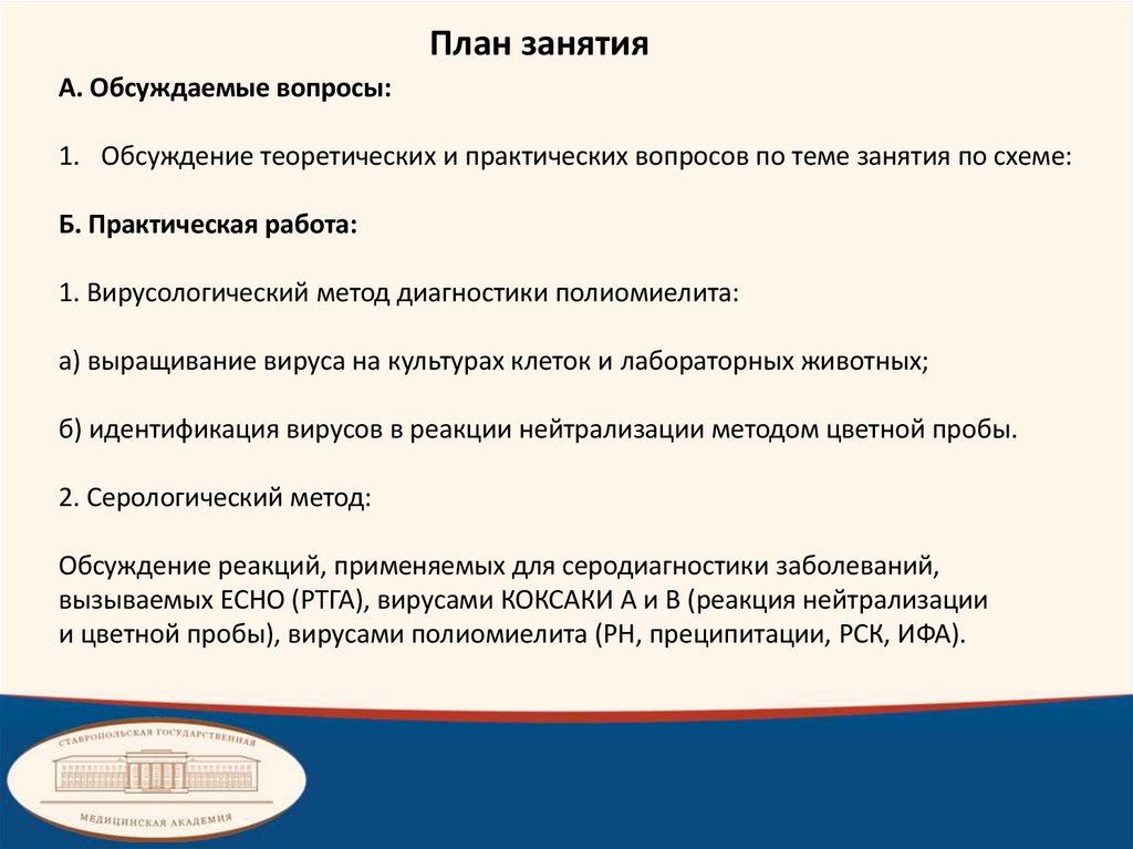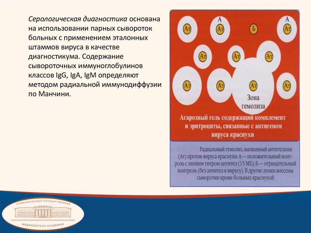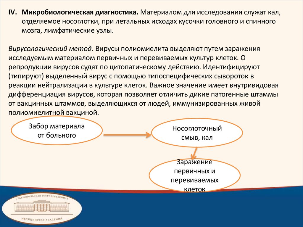 и цветной пробы), вирусами полиомиелита (РН, преципитации, РСК, ИФА).