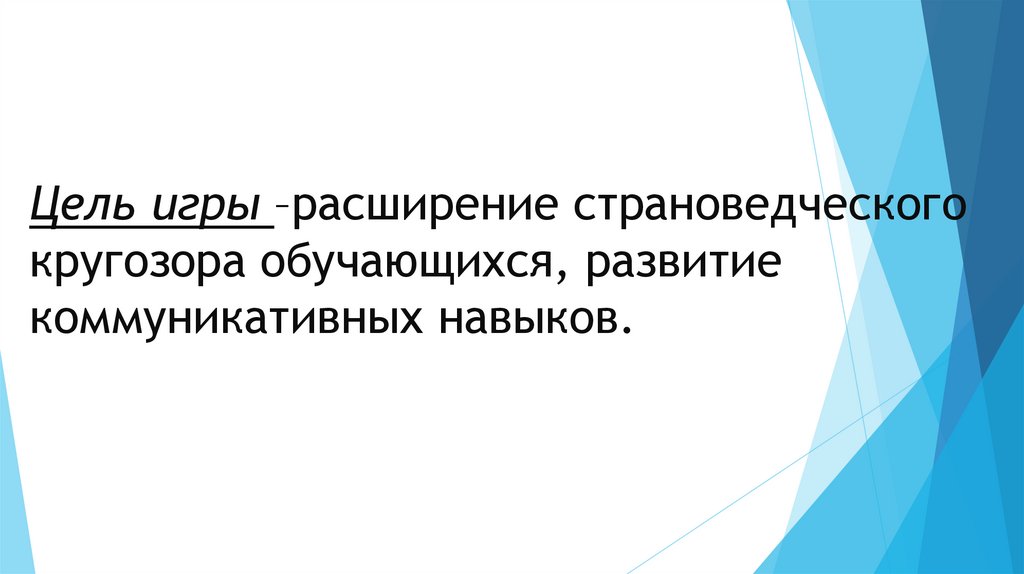 Цель игры –расширение страноведческогокругозора обучающихся, развитие