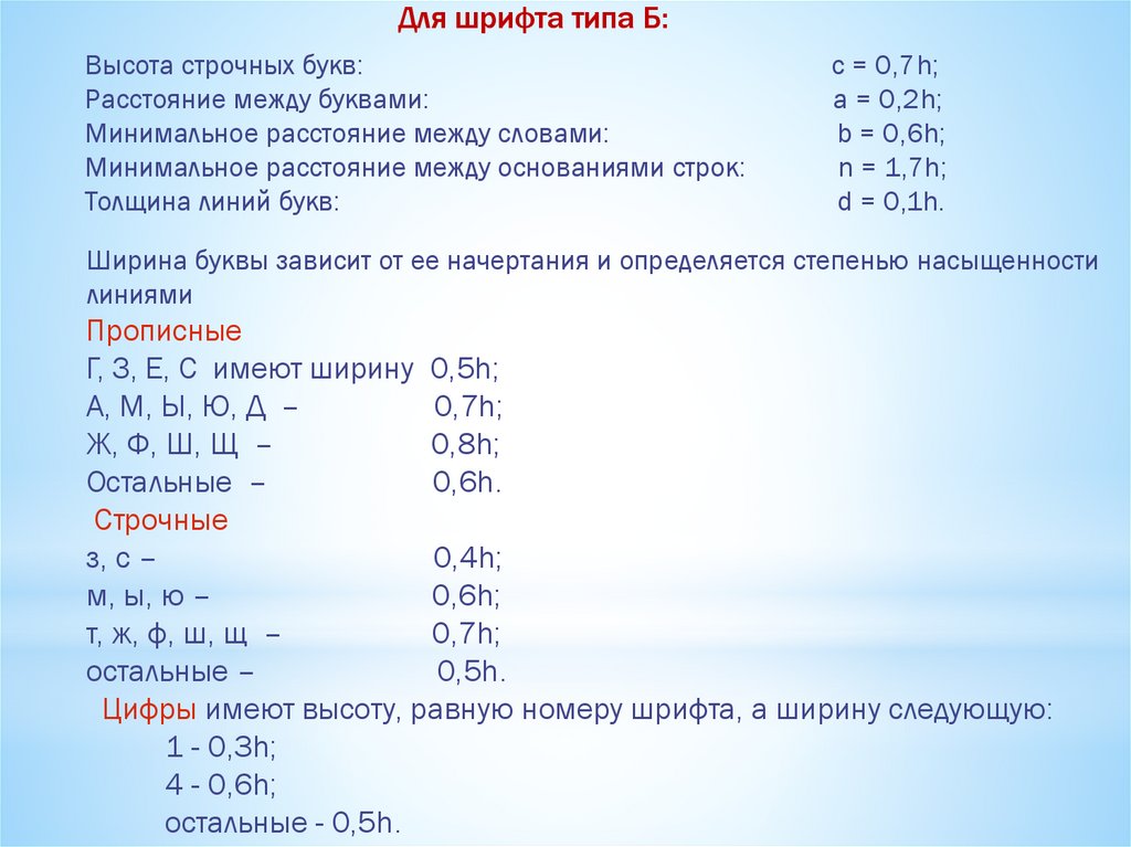 Различают два типа шрифта: тип А и тип Б, параметры которых кратны 1/14h и