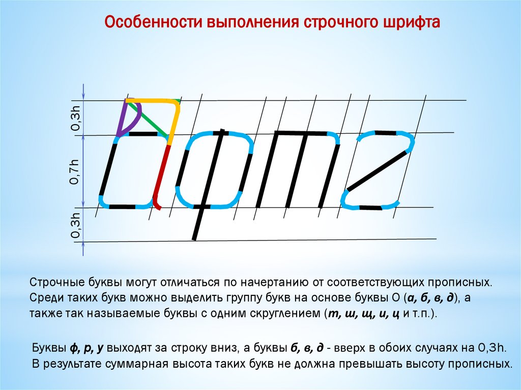 Буквы ф, р, у выходят за строку вниз, а буквы б, в, д - вверх в обоих случаях на 0,3h.