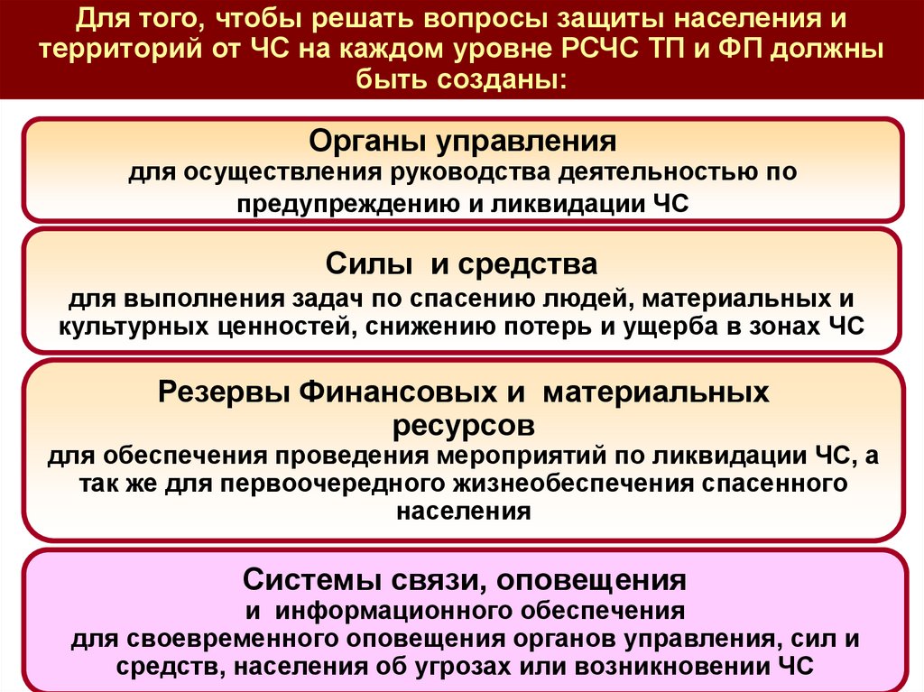 Для того, чтобы решать вопросы защиты населения итерриторий от ЧС на каждом уровне РСЧС ТП и ФП должны
