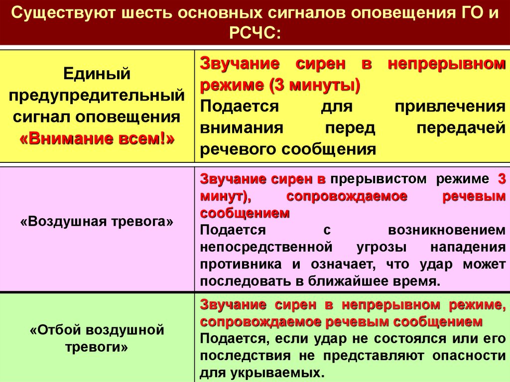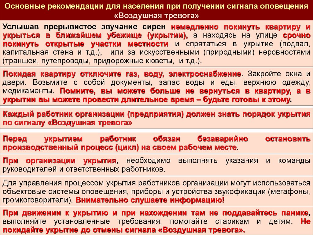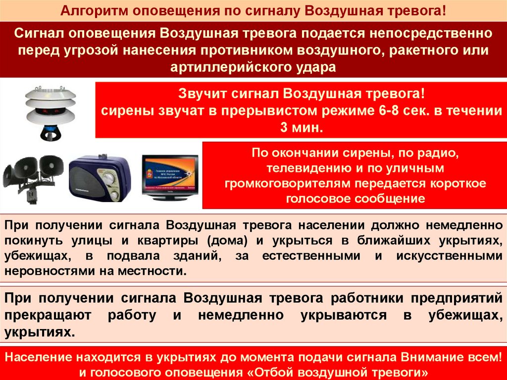 «Воздушная тревога», а так же при объявлении эвакуации.