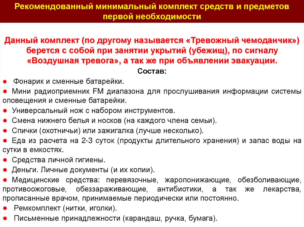 Рекомендованный минимальный комплект средств и предметовпервой необходимости