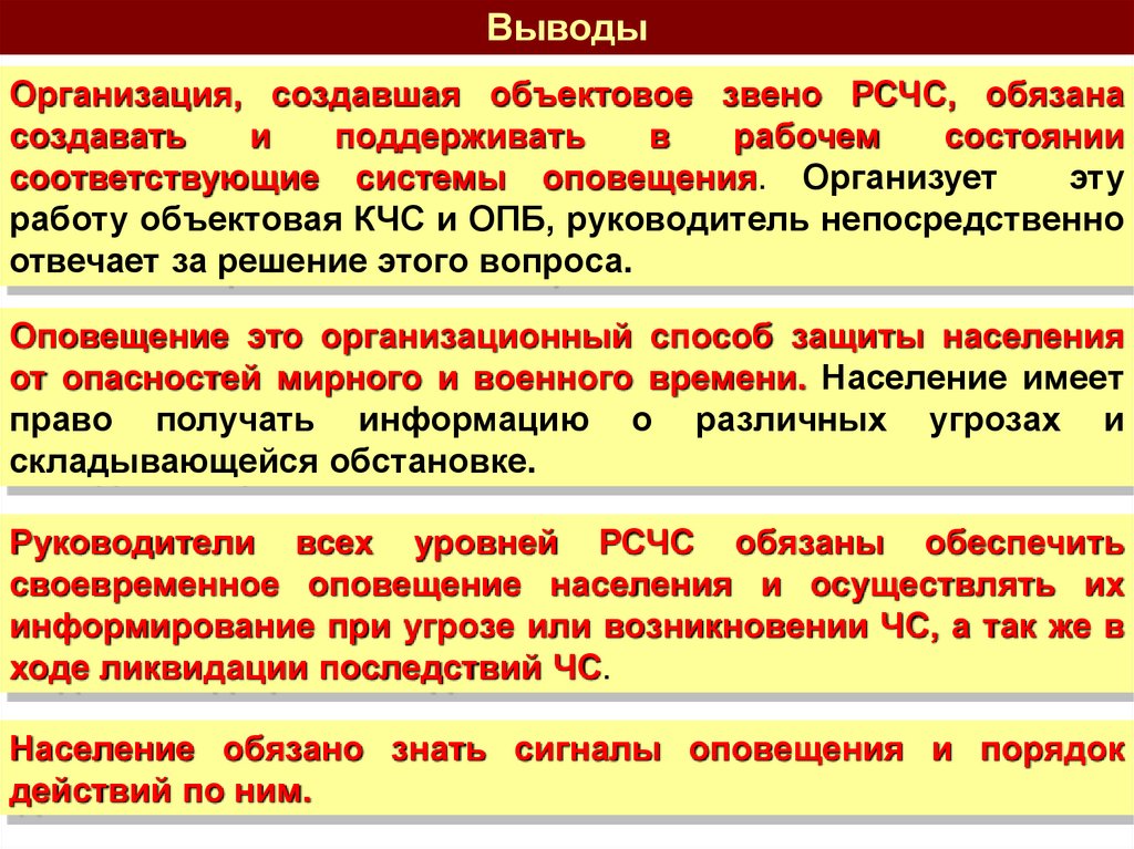 ВыводыОрганизация, создавшая объектовое звено РСЧС, обязана