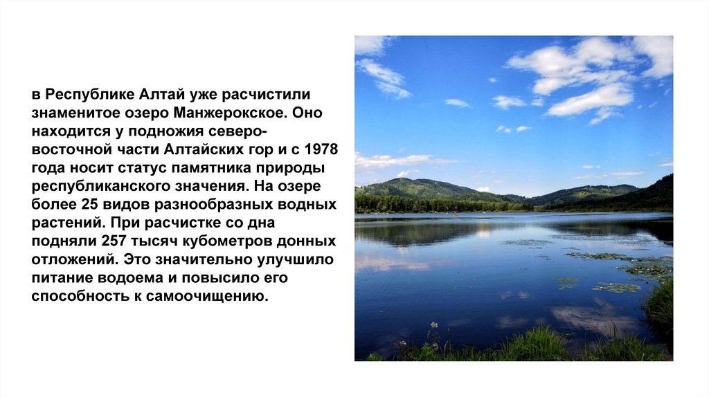 в Республике Алтай уже расчистилизнаменитое озеро Манжерокское. Оно