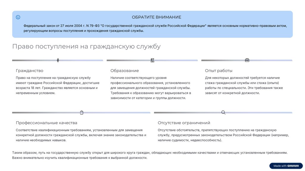 Таким образом, путь на государственную службу открыт для широкого круга граждан, обладающих необходимыми качествами и отвечающих установленным требованиям.