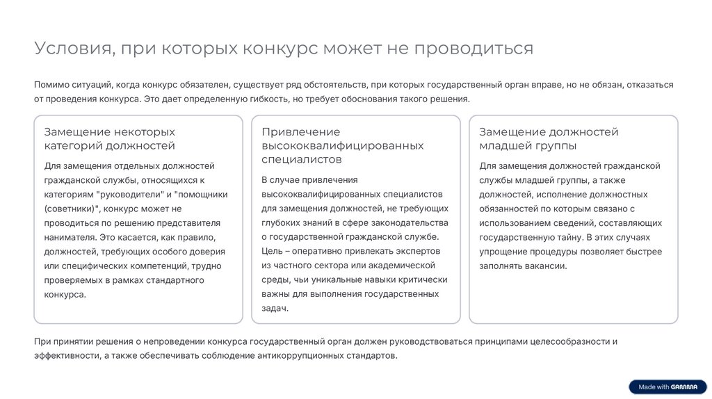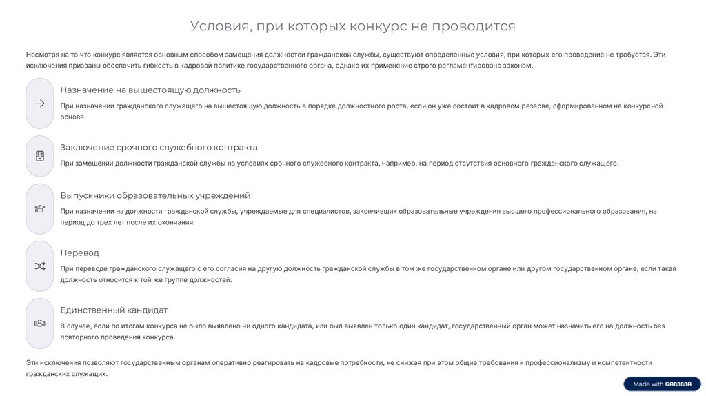 Условия, при которых конкурс не проводитсяНесмотря на то что конкурс является основным способом замещения должностей гражданской службы, существуют определенные условия, при которых его проведение не требуется. Эти