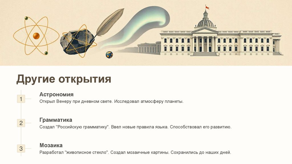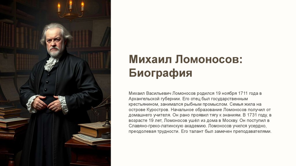 Наследие ЛомоносоваМихаил Ломоносов – выдающийся учёный и просветитель. Его вклад
