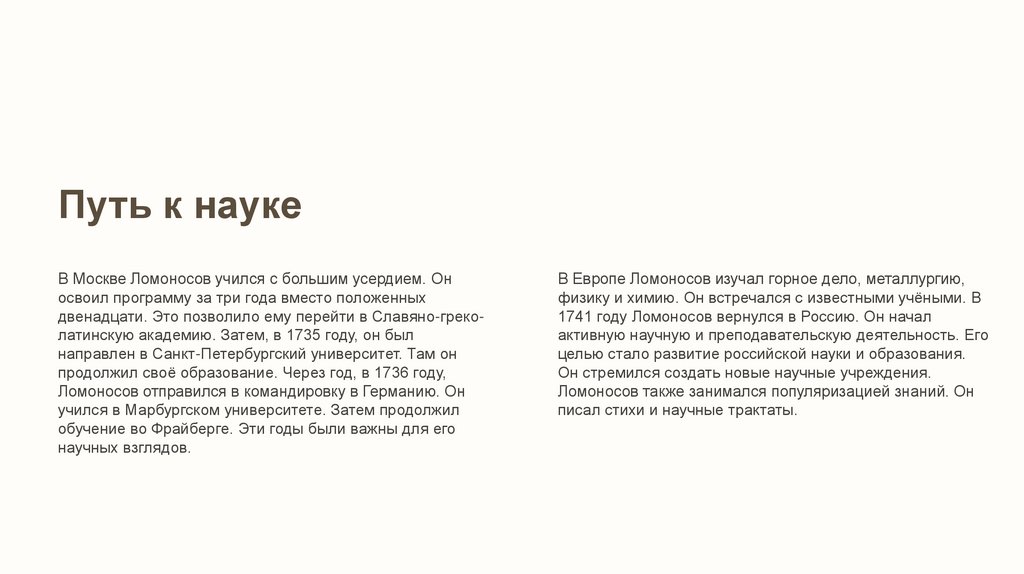 Он организовал экспедиции для научных исследований. Ломоносов переводил научные труды. Он писал учебники.