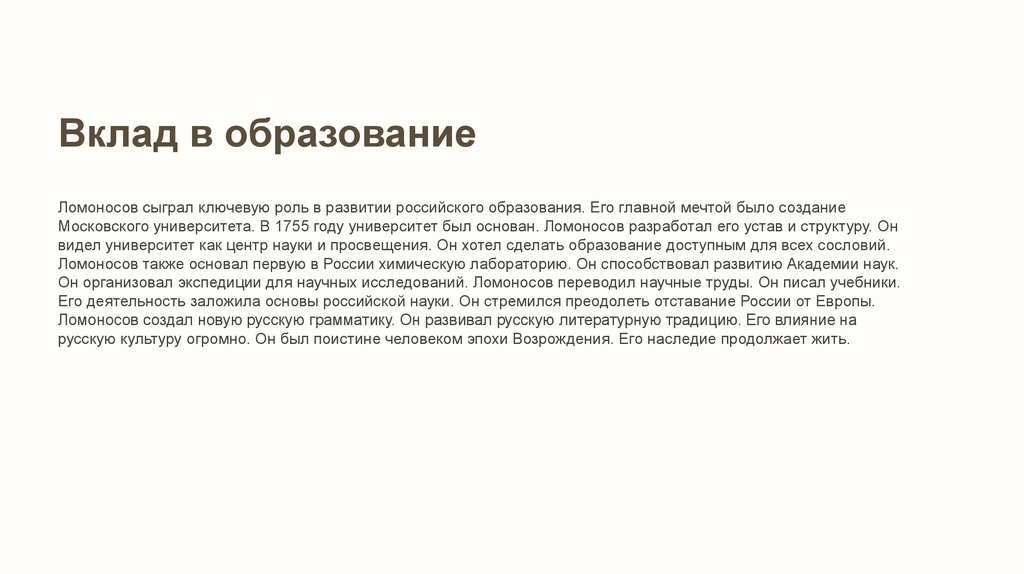 Вклад в образованиеЛомоносов сыграл ключевую роль в развитии российского образования. Его главной мечтой было создание