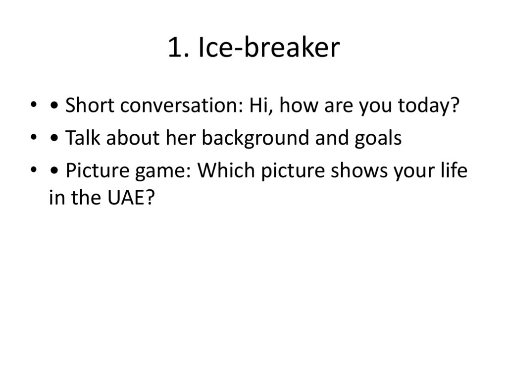 1. Ice-breaker• • Short conversation: Hi, how are you today?