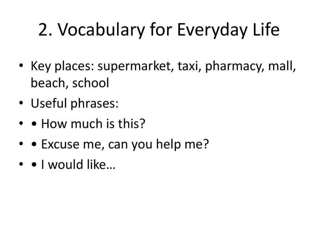 2. Vocabulary for Everyday Life• Key places: supermarket, taxi, pharmacy, mall,