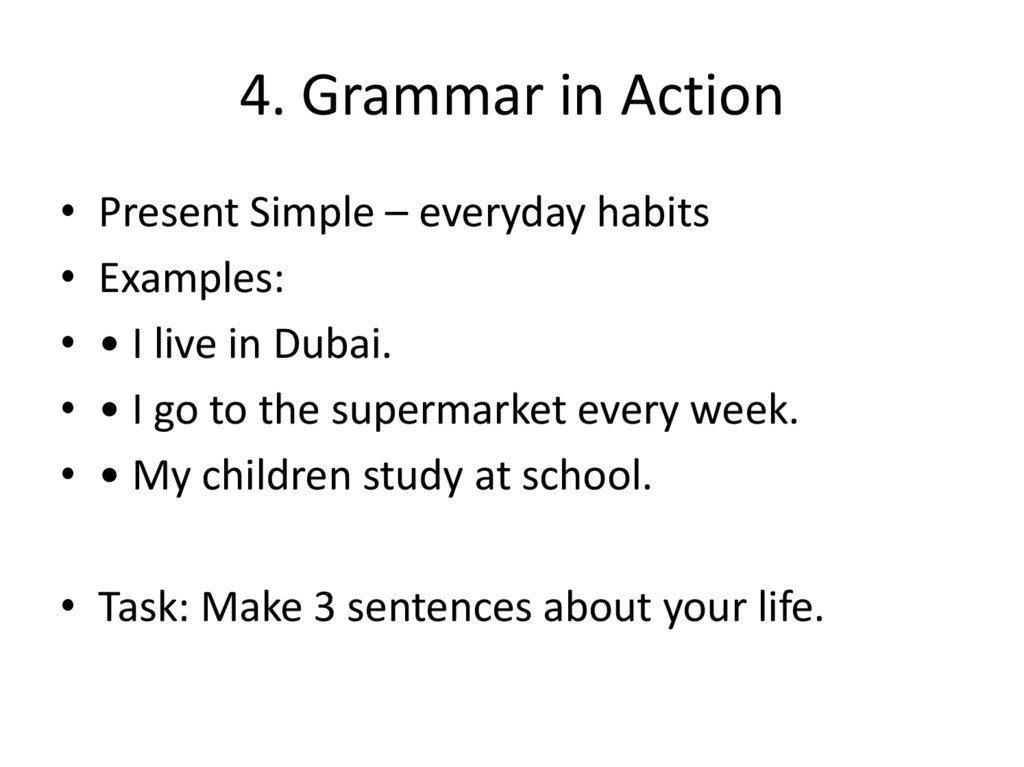 4. Grammar in Action• Present Simple – everyday habits