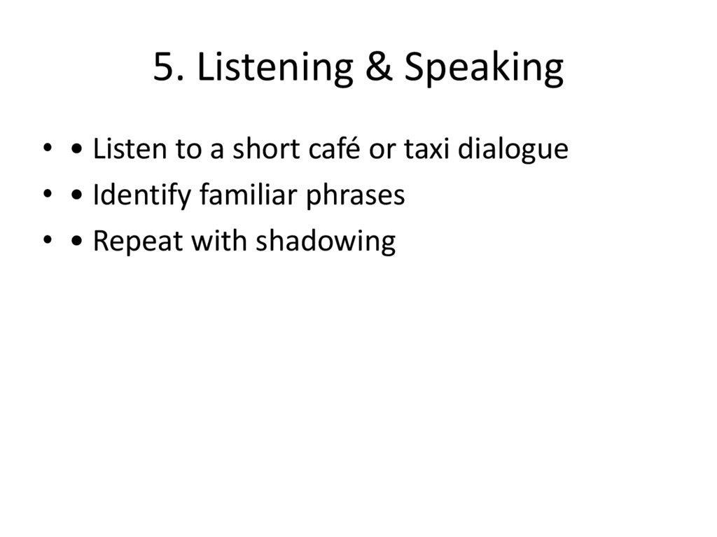 5. Listening & Speaking• • Listen to a short café or taxi dialogue