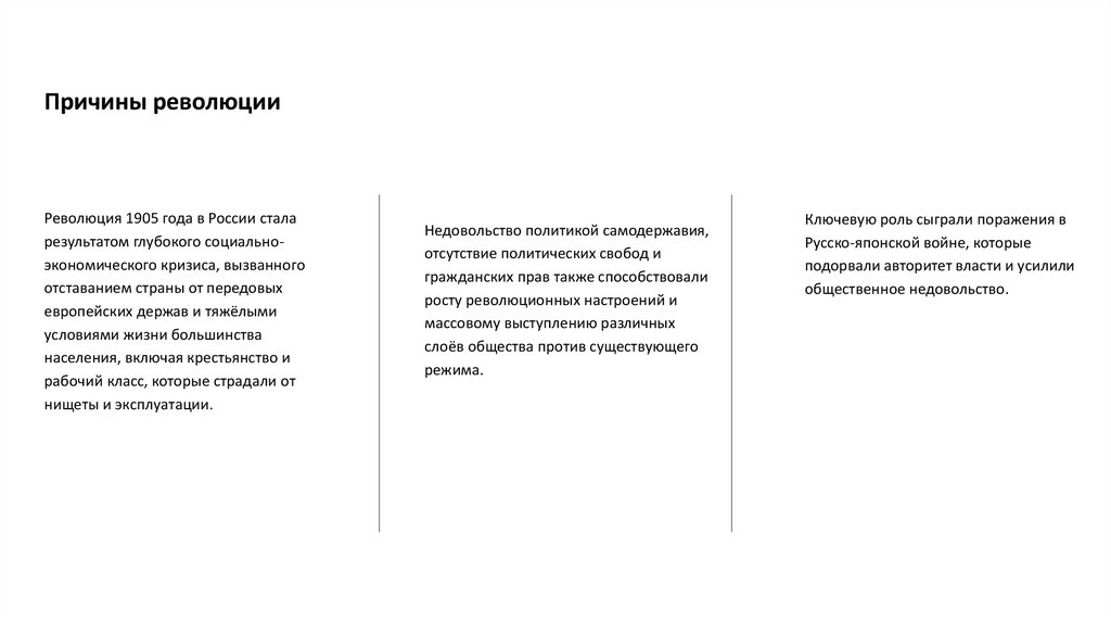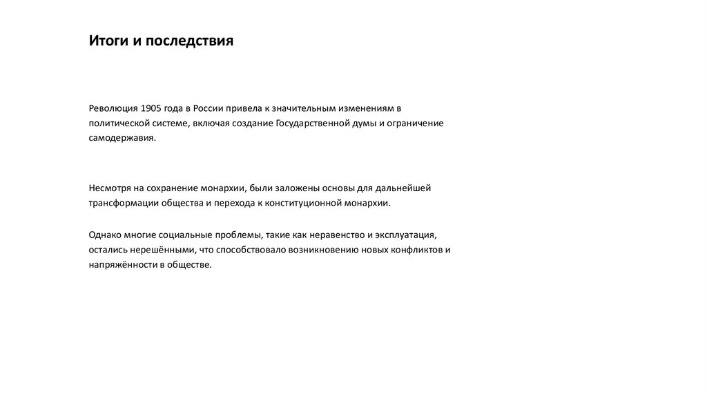 Итоги и последствияРеволюция 1905 года в России привела к значительным изменениям в