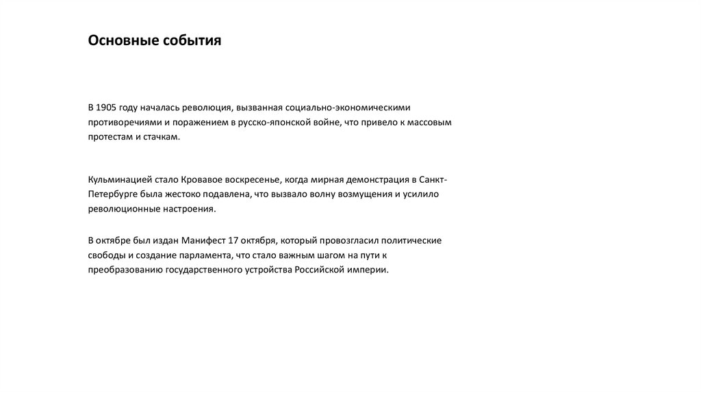 Кульминацией стало Кровавое воскресенье, когда мирная демонстрация в СанктПетербурге была жестоко подавлена, что вызвало волну возмущения и усилило
