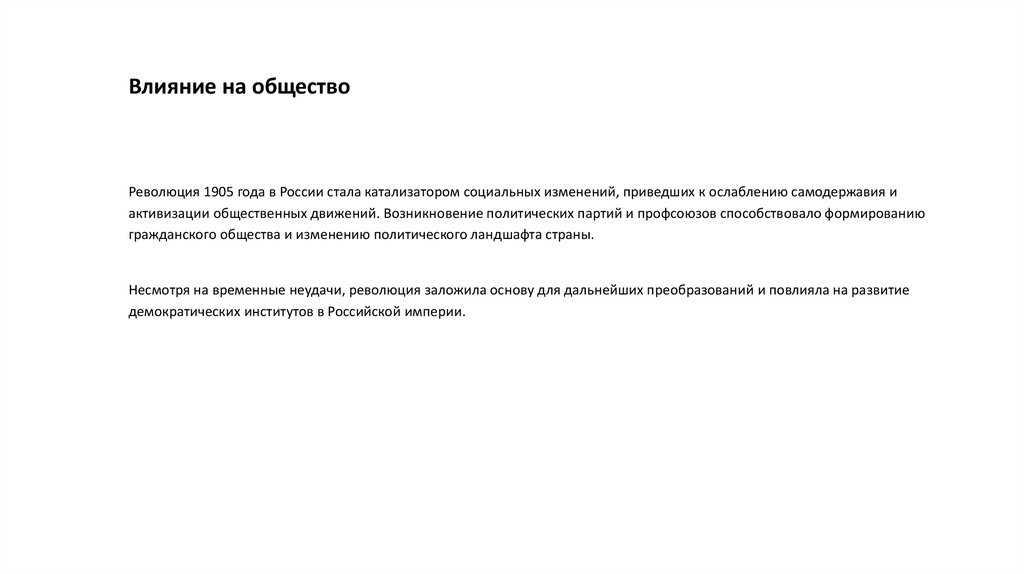 Влияние на обществоРеволюция 1905 года в России стала катализатором социальных изменений, приведших к ослаблению самодержавия и