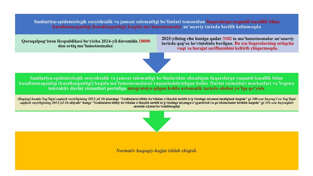 Sanitariya-epidemiologik osoyishtalik va jamoat salomatligi bo‘limlari tomonidan fuqarolarga yuqumli kasallik bilankasallanmaganligi (kasallanganligi) haqida ma’lumotnomalar an’anaviy tarizda berilib kelinmoqda