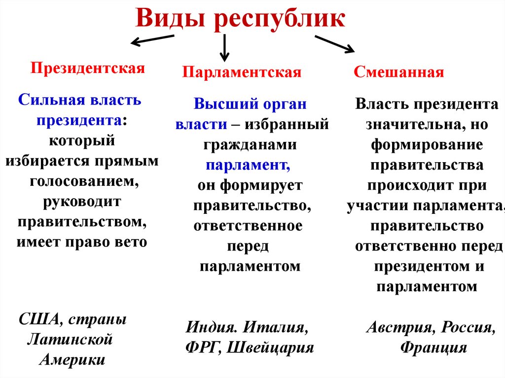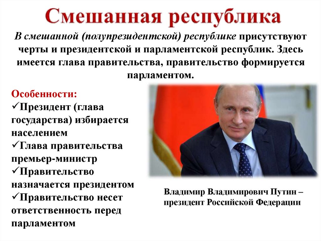 В смешанной (полупрезидентской) республике присутствуютчерты и президентской и парламентской республик. Здесь