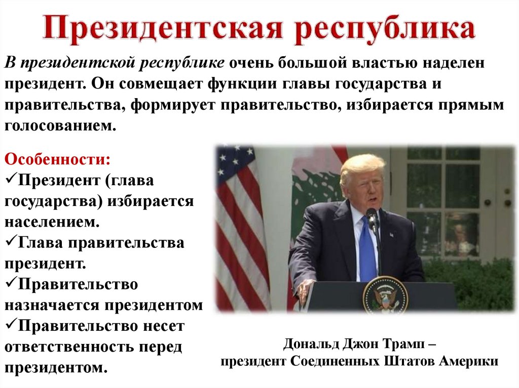 В президентской республике очень большой властью наделенпрезидент. Он совмещает функции главы государства и