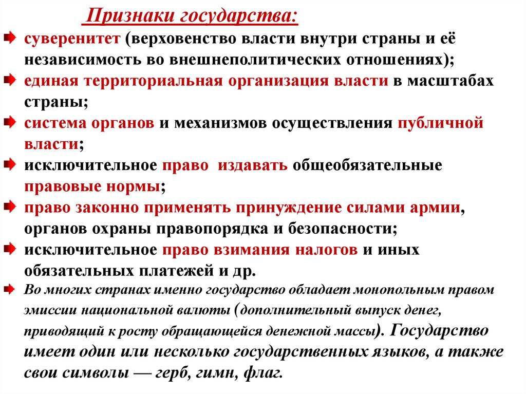 Признаки государства:суверенитет (верховенство власти внутри страны и её