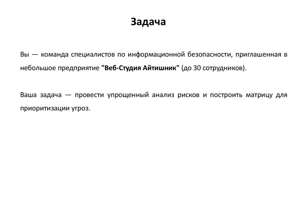 ЗадачаВы — команда специалистов по информационной безопасности, приглашенная в