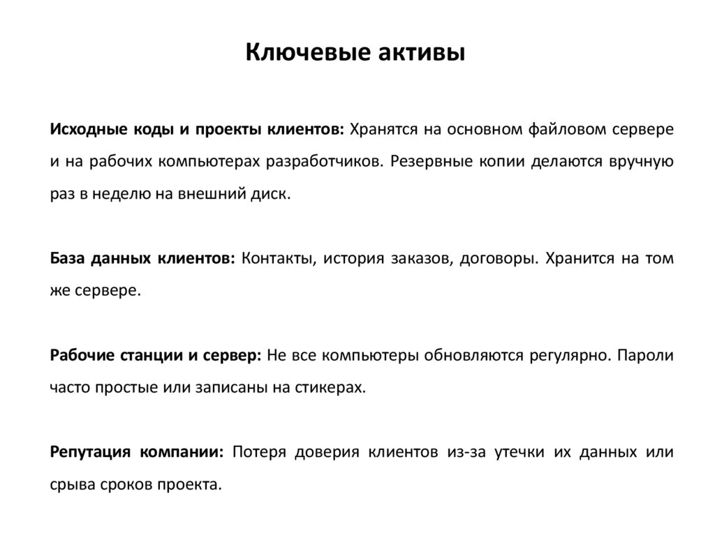 Ключевые активыИсходные коды и проекты клиентов: Хранятся на основном файловом сервере